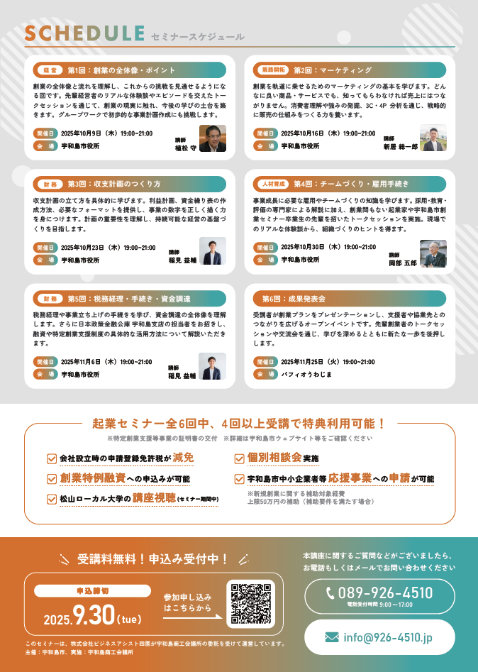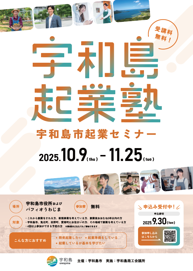 宇和島起業塾のご案内:10月9日から全6回(9/30申込締切)2025年08月14日