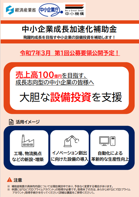 宇和島商工会議所 > 各種補助金・助成金 > 国の補助金・助成金 > 中小企業成長加速化補助金(売上高100億円を目指す、成長志向型の中小企業の皆様へ)令和7年6月9日締め切り(第一次)