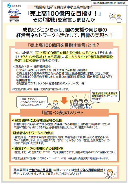 概要・公募要領についてはこちら 補助金要件②の売上高100億円を目指す宣言の詳細はこちら (※宣言できる企業は、売上高10億円~100億円未満の中小企業です。 ※中小企業は、原則として、中小企業基本法に基づく中小企業者又は法人税法に基づく中小法人です。) 詳細についての問い合わせ等についてはお答えできませんのでご了承ください。