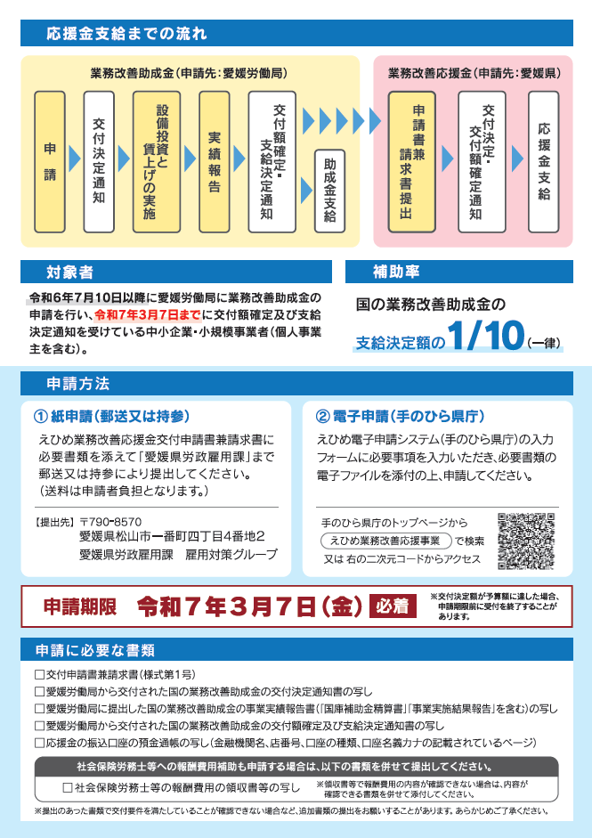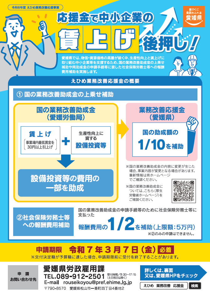 愛媛県では、物価高騰の影響を受ける中、生産性の向上を図りながら賃上げを行う中小企業等を支援するため、国の「業務改善助成金」の上乗せ補助や、同助成金の申請手続等に要した社会保険労務士等の報酬費用の一部を補助します。