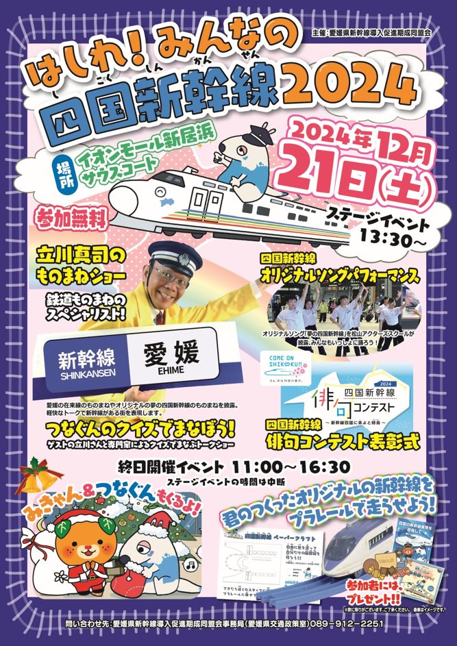 四国への新幹線導入に向けて、さらなる機運を高めるためのイベントがやってきます!楽しい企画が盛りだくさん!皆さん、ぜひお友達やご家族と一緒にお越しください!