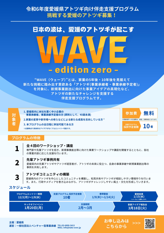 愛媛県は、県内中小企業の事業承継に対する前向きな意識醸成や早期の事業承継の促進を図るため、家業の5年後、10年後を見据えて新たな挑戦に踏み出す、意欲ある「アトツギ(事業承継者・事業承継予定者)」を対象に、新規事業創出に向けた事業アイデアの具現化など、アトツギの新たなチャレンジを支援する伴走支援プログラム「WAVE(ウェーブ)」を実施しています。