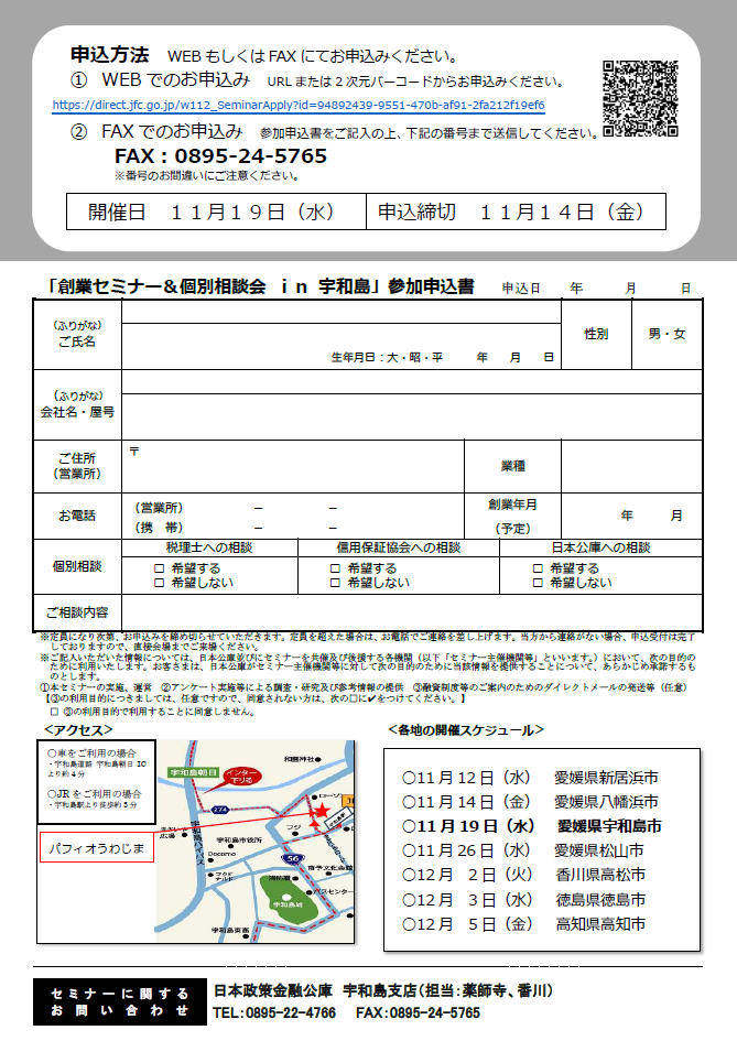宇和島商工会議所 > トピックス > 創業セミナー&個別相談 in 宇和島 11/19(水)開催
